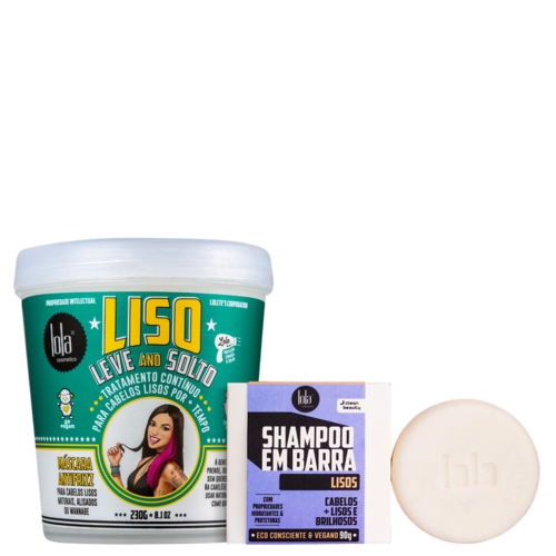 Kit máscara e shampoo em barra para cabelos lisos ou alisados. Kit Lola Cosmetics Lisos e Soltos auxilia na redução do frizz, mantendo os fios alinhados e brilhosos.