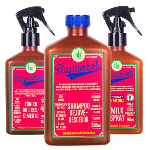 A Linha Lola Rejuvenescedor Rapunzel proporciona uma sensação refrescante, enquanto penetra no couro cabeludo e estimula a micro circulação sanguínea. Além disso, ativa os folículos pilosos promovendo o crescimento dos fios e evitando os estágios precoces da queda do cabelo. Sua poderosa fórmula contém ativos como a Cafeína, Gingko Biloba, Óleo de Jojoba, Pantenol que promove o crescimento mais rápido dos cabelos, além de ajudar a formar fios mais fortes e espessos e atuar no combate a queda; Tea Tree Oil que é um poderoso regenerador capilar e Sodium PCA que restaura e mantém um nível ótimo de hidratação. A Linha Lola Rejuvenescedor Rapunzel proporciona cabelos mais fortes e encorpados, com a função do couro cabeludo equilibrada.