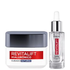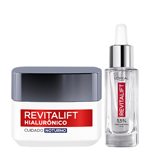 Kit com sérum e creme noturno. Kit L'Oréal Paris Revitalift Hialurônico Anti-Idade promove uma pele mais hidratada e com 40% das linhas de expressão reduzidas em apenas quatro semanas de uso. Perfeito para todos os tipos de pele.