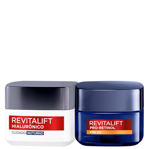 O Kit L'Oréal Paris Revitalift Hialurônico Pro-Retinol une dois produtos que vão promover um tratamento especial no rosto. As propriedades presentes nas fórmulas ajudam a restaurar a textura da derme, além de auxiliarem no combate dos danos do tempo na tez.