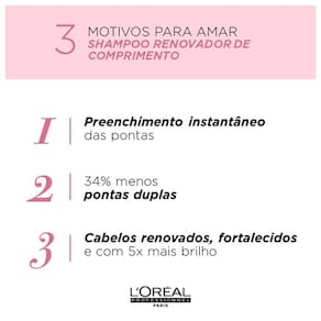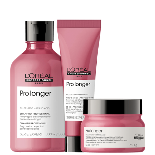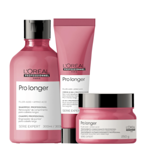 Kit L'Oréal Professionnel Serie Expert Pro Longer Preenchimento de Pontas repara as pontas duplas, proporciona 5X mais brilho, deixa o cabelo mais maleável, além de oferecer proteção térmica e ação antifrizz.