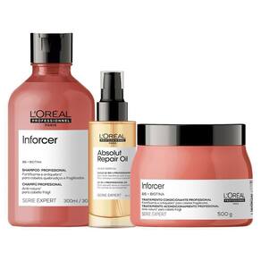 A Linha L'Oréal Professionnel Serie Expert Inforce foi criada para cabelos fracos ou quebradiços. Sua fórmula trata a fibra capilar, garantindo uma ação fortificante anti-quebra.O Kit L'Oréal Professionnel Serie Expert Inforce nutre pronfundamente enquanto ajuda no crescimento do cabelo já existente. Suas fórmulas são perfeitas para quem está querendo deixar os fios compridos com força e saúde.Cuide de seu cabelo com o Kit L'Oréal Professionnel Serie Expert Inforce Resultado:multifuncional SUGESTÃO DE USO:Shampoo1. Distribuir uniformemente por todo o cabelo molhado e fazer espuma;2. Enxaguar completamente.Máscara1. Aplicar no cabelo lavado e úmido;2. Deixar agir por 3 a 5 minutos;3. Enxaguar.Óleo1. Aplique uma pequena quantidade do sérum no cabelo seco;2. Espalhe uniformemente pelos comprimentos e pontas médias e não enxágue;3. Finalize como desejar. Observações:imagem Meramente Ilustrativa. ITENS INCLUSOS:1 Shampoo L'Oréal Professionnel Serie Expert Inforcer 300 ml1 Máscara de Força L'Oréal Professionnel Serie Expert Inforcer 500 g1 Óleo Capilar L'Oréal Professionnel Serie Expert Absolut Repair Gold Quinoa Protein 10 in 1 90 ml Ean: 1012960433124