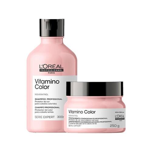 A linha L'Oréal Professionnel Serie Expert Vitamino Color ideal para cabelos coloridos.Kit L'Oréal Professionnel Serie Expert Vitamino Color promove a proteção até das cores mais sensíveis, hidratação e luminosidade para os fios. Além disso, seu principal ingrediente possui um poderoso antioxidante presente na casca e nas sementes das uvas, que tem a função de preservar a cor dos cabelos.Com o Kit L'Oréal Professionnel Serie Expert Vitamino Color preserve a cor de seus cabelos e proteja dos danos Resultado:cuidado da Cor SUGESTÃO DE USO:Shampoo1. Aplique o shampoo sobre o cabelo molhado;2. Massageie com suavidade;3. Enxágue e, se necessário, repita o processo.Máscara1. Aplicar no cabelo lavado e úmido;2. Deixar agir por 3 a 5 minutos;3. Enxaguar. Observações:imagem Meramente Ilustrativa. ITENS INCLUSOS:1 Shampoo L'Oréal Professionnel Serie Expert Vitamino Color 300 ml1 Condicionador L'Oréal Professionnel Serie Expert Vitamino Color 200 ml
