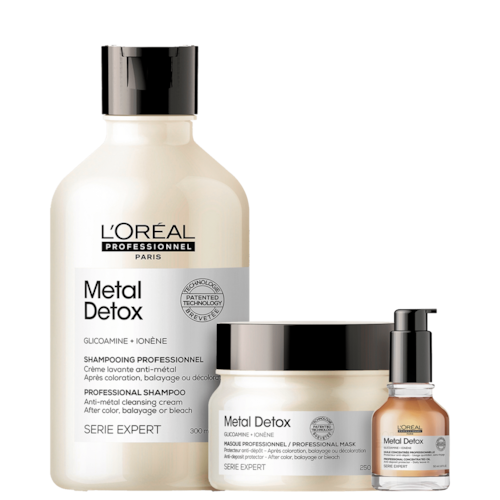 Kit com shampoo, máscara e óleo para cabelos coloridos e danificados. L'Oréal Professionnel Metal Detox Trio Treatment desintoxica o cabelo e ajuda a manter a cor vibrante.