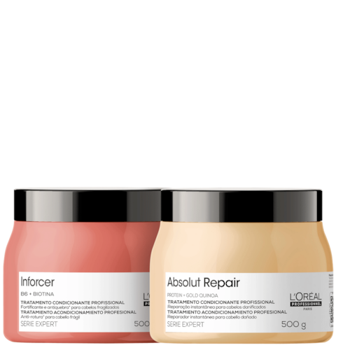O Kit L'Oréal Professionnel Serie Expert Absolut Repair Inforcer Duo Salon traz 2 máscaras de tratamento poderosas, que ajudam a renovar o brilho e maciez dos fios com o resgate da nutrição e hidratação. Além disso, estimulam o crescimento dos fios já existentes contra quebra e com resistência.
