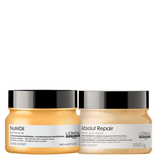 Kit de tratamento com máscaras para cabelos danificados e ressecados. L'Oréal Professionnel Serie Expert Absolut Repair NutriOil Duo I recupera o brilho e a saúde dos fios.