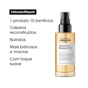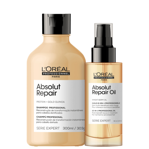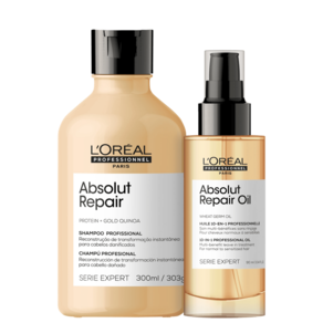 O Kit L'Oréal Professionnel Serie Expert Absolut Repair Oil Intense confere brilho e leveza, na sua rotina de haircare. Atua na reparação da fibra capilar fragilizada e, graças a seus principais ingredientes, a Quinoa Dourada e Proteína Hidrolisada ,os ativos penetram mais profundamente na fibra, para uma selagem e reestruturação definitiva.