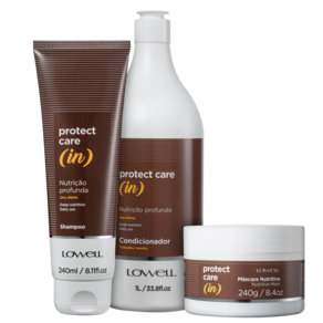 Kit Lowell Protect Care (in) Tripla Ação com shampoo, condicionador e máscara capilar. Nutre profundamente o cabelo, limpa e condiciona. Indicado para cabelos ressecados.