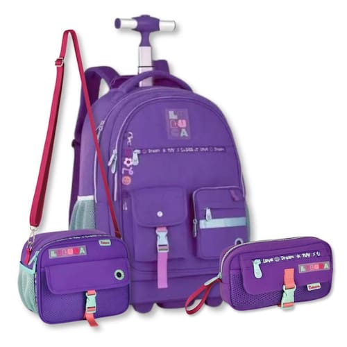 Kit Escolar Luluca - Qualidade Premium para Brilhar na Escola - Mochila LU24599 + Lancheira LU24603 + Estojo LU24604 Este kit é muito mais que acessórios escolares: é uma combinação perfeita de estilo, conforto e organização Disponível em três cores incríveis - preta, rosa ou lilás - ela se destaca pelos detalhes modernos que encantam meninas e adolescentes que adoram estar na moda. Mochila de Carrinho LU24599: Com um compartimento principal super espaçoso, a mochila tem lugar de sobra para todos os materiais escolares e ainda conta com um compartimento acolchoado exclusivo para notebook, oferecendo segurança e praticidade. Na parte frontal, o compartimento grande com zíper e divisórias facilita a organização dos itens pessoais, enquanto os três bolsos adicionais oferecem ainda mais espaço. Os bolsos possuem acabamentos modernos, que dão um charme especial à mochila. Para completar, a mochila conta com bolsos laterais ideais para garrafinhas, garantindo praticidade no dia a dia. E como um toque extra, vem com um chaveiro superestiloso, que é tendência A versatilidade é outro ponto forte: - Modo carrinho: As alças podem ser guardadas em um compartimento exclusivo enquanto sua filha utiliza o sistema de rodinhas, com um puxador ajustável em duas alturas e um bolso para armazenamento do puxador. - Modo mochila: Com alças ajustáveis, acolchoadas e confortáveis, ela pode ser Utilizado nas costas. O protetor de rodinhas garante que as roupas permaneçam limpas e protegidas. Confeccionada em nylon resistente, a mochila traz detalhes sofisticados como zíperes logados, cadarços acetinados coloridos e ilhós personalizado, refletindo qualidade e durabilidade em cada detalhe. - Dimensões aproximadas: 48x35x19 cm. Lancheira Térmica LU24603 Praticidade e charme em uma peça. Essa lancheira térmica possui compartimento principal espaçoso, bolso frontal e bolso lateral telado. Com zíper logado, cadarços acetinados e alça carona, é ideal para manter seus lanches sempre frescos. Dimensões aproximadas: 19x24x12 cm. Estojo LU24604 Compacto, mas super funcional, este estojo é ideal para quem busca organização sem perder o estilo. Possui um compartimento principal, um bolso frontal com zíper e um compartimento telado para itens de fácil acesso. A fivela estilosa harmoniza com o design da mochila, completando o visual. Dimensões aproximadas: 11x20x06 cm. Invista em um Kit que une funcionalidade, beleza e a essência Luluca Um verdadeiro sonho para meninas estilosas