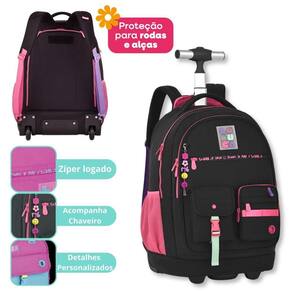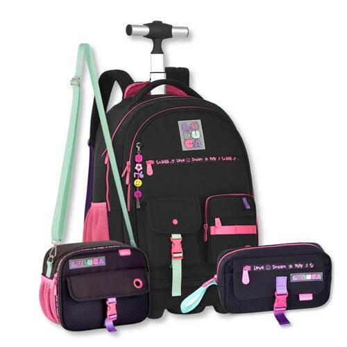 Kit Escolar Luluca - Qualidade Premium para Brilhar na Escola - Mochila LU24599 + Lancheira LU24603 + Estojo LU24604 Este kit é muito mais que acessórios escolares: é uma combinação perfeita de estilo, conforto e organização Disponível em três cores incríveis - preta, rosa ou lilás - ela se destaca pelos detalhes modernos que encantam meninas e adolescentes que adoram estar na moda. Mochila de Carrinho LU24599: Com um compartimento principal super espaçoso, a mochila tem lugar de sobra para todos os materiais escolares e ainda conta com um compartimento acolchoado exclusivo para notebook, oferecendo segurança e praticidade. Na parte frontal, o compartimento grande com zíper e divisórias facilita a organização dos itens pessoais, enquanto os três bolsos adicionais oferecem ainda mais espaço. Os bolsos possuem acabamentos modernos, que dão um charme especial à mochila. Para completar, a mochila conta com bolsos laterais ideais para garrafinhas, garantindo praticidade no dia a dia. E como um toque extra, vem com um chaveiro superestiloso, que é tendência A versatilidade é outro ponto forte: - Modo carrinho: As alças podem ser guardadas em um compartimento exclusivo enquanto sua filha utiliza o sistema de rodinhas, com um puxador ajustável em duas alturas e um bolso para armazenamento do puxador. - Modo mochila: Com alças ajustáveis, acolchoadas e confortáveis, ela pode ser Utilizado nas costas. O protetor de rodinhas garante que as roupas permaneçam limpas e protegidas. Confeccionada em nylon resistente, a mochila traz detalhes sofisticados como zíperes logados, cadarços acetinados coloridos e ilhós personalizado, refletindo qualidade e durabilidade em cada detalhe. - Dimensões aproximadas: 48x35x19 cm. Lancheira Térmica LU24603 Praticidade e charme em uma peça. Essa lancheira térmica possui compartimento principal espaçoso, bolso frontal e bolso lateral telado. Com zíper logado, cadarços acetinados e alça carona, é ideal para manter seus lanches sempre frescos. Dimensões aproximadas: 19x24x12 cm. Estojo LU24604 Compacto, mas super funcional, este estojo é ideal para quem busca organização sem perder o estilo. Possui um compartimento principal, um bolso frontal com zíper e um compartimento telado para itens de fácil acesso. A fivela estilosa harmoniza com o design da mochila, completando o visual. Dimensões aproximadas: 11x20x06 cm. Invista em um Kit que une funcionalidade, beleza e a essência Luluca Um verdadeiro sonho para meninas estilosas