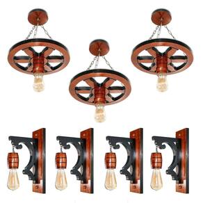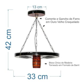 Kit luminárias rústicas coloniais em madeira maciça 4 lustres pendentes modelo roda de carroça - 33cm de diâmetro 3 arandelas coloniais modelo barril