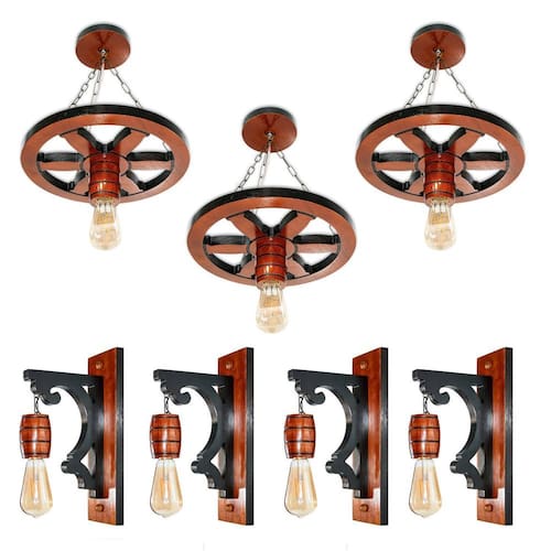 Kit Luminária Roda De Carroça E Arandelas Colonial Madeira