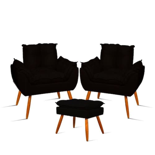 Transforme o seu ambiente com o Kit 02 Poltronas + 01 Puff Opala. Kit super multifuncional que une conforto, beleza e praticidade. Ideal para áreas de estar, cantinhos de leitura e até mesmo ambientes comerciais.