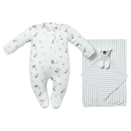 O Kit Macacão + Cueiro + Naninha da Hug é a opção completa para proporcionar conforto e aconchego ao bebê. Com um macacão macio e delicado, ideal para a pele sensível, um cueiro que oferece proteção e segurança nos momentos de descanso e uma naninha fofa para acalmar e acompanhar o bebê, o kit traz praticidade e carinho ao dia a dia. Cada peça é feita com a qualidade e cuidado que a Hug oferece, pensando sempre no bem-estar dos pequenos. DIFERENCIAIS Nossas malhas 100% algodão passam por rigorosos processos de qualidade. Selecionamos fios de algodão com fibras longas e de altíssima qualidade, proporcionando um toque suave e duradouro em nossos suedines. Nossas tecelagens utilizam teares modernos que transformam os melhores fios em malhas estáveis, duradouras e confortáveis, com um nível ideal de gramatura, permitindo uma troca de temperatura natural e saudável entre a pele sensível do bebê e o ambiente. Nossas estampas digitais são produzidas com os métodos mais modernos do mundo, resultando em desenhos autorais com traços delicados e suaves. As tintas utilizadas possuem certificação OEKO-TEX® ECO PASSPORT e são à base de água, tornando o processo totalmente ecológico e seguro para a pele humana. Isso nos permite economizar até 95% dos recursos ambientais em comparação com outros métodos tradicionais da indústria têxtil. - Estampa exclusiva HUG Macacão com zíper CARACTERISTICAS Gênero: Menino Cor: Off White Composição: Suedine 100% algodão