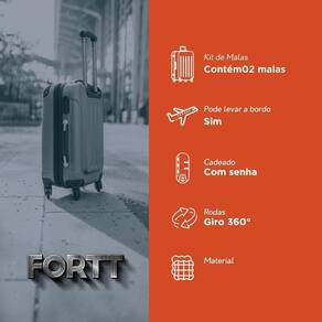 Kit Mala de Viagem abs 2 peças Adventure e Action Fortt Cinza MAB01-CZA Mala de Bordo Adventure Fortt, foi desenvolvida com o que há de mais moderno. Ela é produzida em ABS, que é um material resistente e de fácil limpeza. Possui 4 rodas com giro de 360, é equipada com cadeado fixo, com senha configurável para a proteção de seus itens e internamente, possui cintas elásticas para lhe ajudar na organização de seus pertences.Pode ser utilizada como bagagem de mão em aviõesCaracterísticas Parte Externa:Cor: CinzaEstrutura rígida em ABSCadeado fixo com senha configurávelAlça de alumínio retrátil com regulagem de alturaAlça superior e lateral4 Rodas com giro 360Parte Interna:Forro em nylonCinta elástica com travaBolso interno na tampaAmplo espaço interno2 Compartimentos internosMALA 20Dimensões externas:Altura com a alça totalmente esticada: 90cmAltura com a alça abaixada: 54cmLargura: 36cmProfundidade: 20cmDimensões internas:Altura: 47cmLargura: 35cmProfundidade: 18,5cmPeso suportado: 10 kgPeso: 2,4kgMAPA 18Dimensões externas:Altura com a alça totalmente esticada: 90cmAltura com a alça abaixada: 51 cmLargura: 32,5 cmProfundidade: 22,5 cmDimensões internas:Altura: 44 cmLargura: 32 cmProfundidade: 11 cmPeso suportado: 10 kgPeso: 2,4kgGarantia legal de 90 dias para defeito de fabricação.- Material resistente com um rigoroso controle de qualidade, unindo versatilidade, praticidade e durabilidade.- O tom da cor do produto pode variar de acordo com lote e/ou características do seu monitor ou tela.- Fotos Meramente ilustrativas. Marca: Fortt | Modelo: MAB01-CZ | Cor: Cinza | Garantia (Meses): 3 | Quantidade de rodas: 4 | Capacidade (Kg): 10 | Peso (Kg): 2.4 | Divisórias Internas: Sim | Cinta Elástica Interna: Sim | Tipo de Rodas: ABS | Puxador: Sim | Cadeado com segredo: Sim