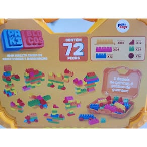 Kit Maleta Blocos de Montar Criar Divertire Inventar e desmontar 72 Pakitoys peças Com a Maleta Infantil Blocos De Montar 72 Peças Paki Toys a brincadeira nunca acaba. Isso porque, este brinquedo é lúdico e possibilita que as crianças usem toda a imaginação para criar.Os blocos de montar estimulam o desenvolvimento e a imaginação dos seus filhos, além de contribuir para a percepção de cores e desenvolver a coordenação motora.Recomendado para crianças a partir de 3 anos de idade, os blocos de montar possuem 72 peças e acompanham uma embalagem prática que permite que os blocos sejam guardados na própria embalagem. Dimensões aproximada da embalagem: 22cm de altura x 8cm de largura x 26 comprimento Marca: Pakitoys CONTÉM: 1 maleta Homologação Inmetro: CE-BRI/ICEPEX-N 01396-65-1 Ean: 7898676720840