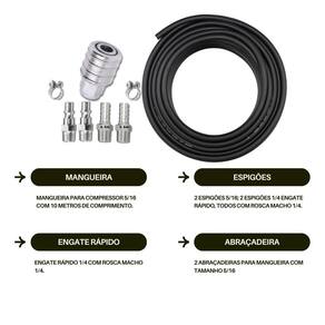 1x Espigão M. FX 1/4 NPT x Mangueira 5/16: Perfeito para adaptar a mangueira ao sistema de ar, garantindo uma conexão firme e segura.