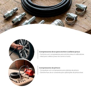 Um kit completo, resistente e pronto para uso, ideal para quem precisa de eficiência e praticidade no dia a dia. Garanta agora o seu kit de mangueira para compressor e tenha muito mais desempenho em suas tarefas.