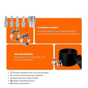 Um kit completo, resistente e pronto para uso, ideal para quem precisa de eficiência e praticidade no dia a dia. Garanta agora o seu kit de mangueira para compressor e tenha muito mais desempenho em suas tarefas.