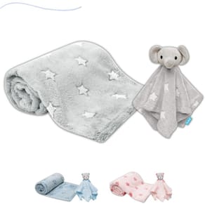 Principais características do kit: Mantinha e naninha de 100% poliéster Toque macio e aconchegante Naninha de pelúcia com ursinho ou elefantinho Cores azul, rosa ou cinza com estampa de estrelinhas Idade indicada: 3 meses ou mais Certificado pelo inmetro: ce-bri/innac 00110-03a nm 300/2002 ocp 0061 Homologação Inmetro: IP-BRI-0117/18