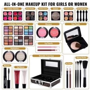 Componentes Incluídos 2 lápis olhos, 2 lápis lábios, 1 máscara, 1 pó facial, 4 puffs, 4 pincéis, 6 paletas sombras, 2 blushes, 2 iluminadores, 1 contorno, 2 paletas labiais, 1 pó sobrancelhas, 1 sombra cremosa, 1 corretivo cremoso, 2 gels labial, estojo alumínio com espelho