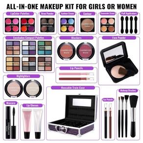 Kit maquiagem completo CHARMCODE com estojo de alumínio reutilizável, contendo 2 lápis para olhos, 2 lápis para lábios, 1 máscara, 1 pó facial compacto, 4 aplicadores puff, 4 pincéis, 6 paletas compactas de sombras, 2 blushes, 2 iluminadores, 1 contorno, 2 paletas compactas de cores labiais, 1 pó para sobrancelhas compacto, 1 sombra cremosa compacta, 1 corretivo cremoso compacto, 2 tubos de gel cremoso labial e espelho acoplado.