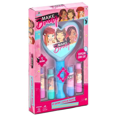 Kit Maquiagem Infantil Batons e Espelho Mágico PolibrinqTestada Dermatologicamente e aprovada pela AnvisaUm kit de maquiagem completo para as meninas arrasarem no look. Marca, PolibrinqModelo, Kit batom e espelho mágicoLinha, MakeBrinqConteúdo da embalagem, 05 itens01 Espelho com luz. Dimensões do espelho, A x L 20 x 11 cm04 batons com cores diferentesProduto certificado/comprovado pela ANVISADermatologicamente testado, não provoca alergia e nem intoxicaçãoTodos os itens são testados dermatologicamente, portanto seguros às crianças. São atóxicos e inofensivos.