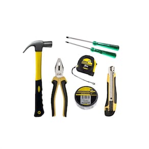 Conteúdo da embalagem: - 01 martelo polido cabo feito de fibra de vidro 23mm. - 01 alicate universal de abertura de 8 feito de aço carbono emborrachado. - 01 trena 5mx25mm ponta imantada emborrachada profissional. - 01 estilete de precisão profissional emborrachado 18mm. - 01 fita isolante rolo 5m 19mm profissional emborrachada. - 01 chave de fenda 3/16 x 4 cabo transparente verde. - 01 chave philips 3/16 x 4 cabo transparente verde. Marca: Não Informado