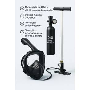 Combo Máscara De Mergulho + Cilindro De Oxigênio + Bomba De Ar Sua aventura subaquática começa aqui Mergulhe com segurança, respire com liberdade Transforme suas aventuras aquáticas com este combo completo que reúne uma Máscara de Snorkel Facial, um Mini Cilindro de Mergulho de 0,5L e uma Bomba de Ar Manual de Alta Pressão - ideal para quem quer explorar o mundo subaquático com conforto, praticidade e segurança. Tecnologia e Qualidade Premium Mini cilindro em alumínio de aviação 6061: máxima resistência e durabilidade. Pressão máxima de 3000 PSI 200 BAR / 20 MPa : potência e confiabilidade. Manômetro luminoso: monitore a pressão com facilidade. Válvulas de alívio de segurança: mergulhe tranquilo. Experiência Subaquática Incrível Campo de visão de 180º: visão panorâmica e imersiva. Tecnologia antiembaçante: visão sempre clara, livre de névoa. Máscara facial completa: conforto e vedação superior. Prático e Versátil Transição perfeita entre snorkel e mergulho. 3 métodos de recarga: Bomba manual de alta pressão inclusa . Adaptador para cilindros. Inflador elétrico não incluso . Instalação rápida com adaptador de conexão direta. O que você recebe neste super combo 2 x Snorkels secos 1 x Máscara de Snorkel Facial Completa 1 x Mini Tanque de Mergulho 0,5L 1 x Bomba de Ar Manual de Alta Pressão Retentores reserva + Chave de manutenção Observação Importante: O mini tanque possui capacidade para aproximadamente 5 a 10 minutos de mergulho, ideal para pequenas explorações, segurança e treinamento. Com a bomba de alta pressão inclusa, você pode reabastecer facilmente e aproveitar ainda mais a sua experiência Explore mais. Mergulhe com confiança. Adquira já o seu Combo Máscara + Cilindro + Bomba e leve sua aventura subaquática a um novo nível limitado Garanta o seu agora mesmo