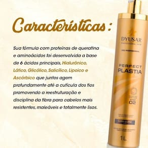 A escova Progressiva Dyusar Perfect Plastia é um realinhamento capilar sem formol que alisa 100% todos os tipos de cabelos ao mesmo tempo em que trata e hidrata, protegendo os fios e repondo a massa capilar para maciez, brilho e efeito liso duradouro. Sua fórmula com proteínas de queratina e aminoácidos foi desenvolvida a base de 6 ácidos principais, Hialurônico, Lático, Glicólico, Salicílico, Lipoico e Ascórbico que juntos agem profundamente até a cutícula dos fios promovendo a reestruturação e disciplina da fibra para cabelos mais resistentes, maleáveis e totalmente lisos.