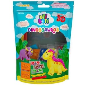 Kit Massinha de Modelar Dinossauros Utiguti 03 massinhas soft 50g. 02 moldes de plástico. 01 rolinho. 01 faquinha. Não mancha - Contém glúten - Não tóxico. Embalagem abre e fecha, com fecho hermético. Recomendado para crianças a partir de 3 anos. Composição: àgua, carboidrato de cereais, cloreto de sódio, hidrocarbonetos alifáticos, aroma, conservante e pigmentos.Homologação Inmetro: IP-BRI-4776/2020-01