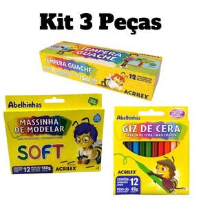 Desperte a imaginação e a diversão com o Kit Acrilex: Massinha de Modelar para moldar sonhos, Giz de Cera para colorir a criatividade e Tinta Guache para dar vida às ideias! Proporcione horas de entretenimento e aprendizado criativo para as crianças. Adquira agora o kit completo e estimule o talento artístico em cada momento de diversão!