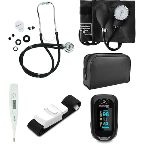- 01 Estetoscópio Rappaport Premium - 01 Ano de Garantia. - 01 Esfigmomanômetro Premium - 01 Ano de Garantia. - 01 Garrote de Elastano Preto - 01 Termômetro Axilar Branco Haste Rígida G-Tech - 01 Ano de Garantia. - 01 Oximetro de Pulso Multilaser - 01 Ano de Garantia. Produtos de qualidade.