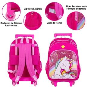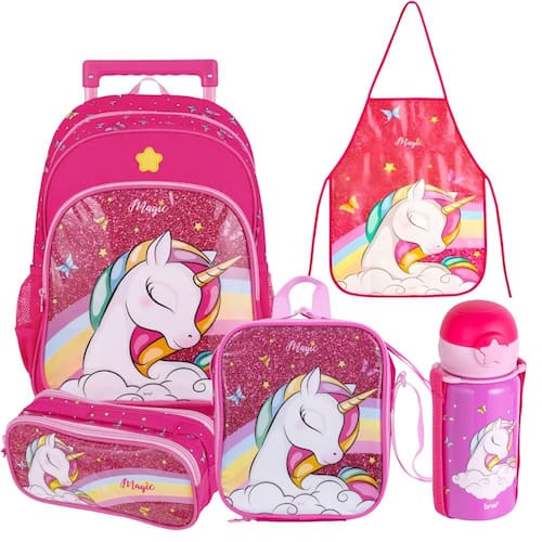 Kit Escolar 5 Itens | Mochila Costas/Rodinhas | Estojo | Lancheira | Garrafa | Avental | Magic |Unicórnio