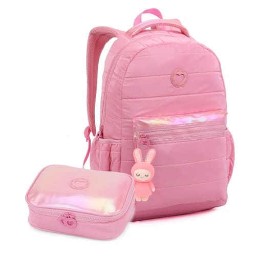 Kit Material Escolar Mochila Estojo Holográfico Chaveiro Coelhinho Reforçada Moderna Tendência Fofa - Cor: Rosa