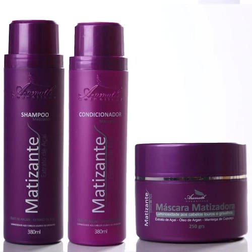 Kit Matizador 380ml Aramath Shampoo roxo máscara Condicionador profissional oiros grisalhos vegano O Shampoo - Formulação exclusiva para cabelos loiros, grisalhos ou com luzes, possui Óleo de Argan que promove reestruturação interna e externa da fibra capilar, dando condicionamento e neutralizando o efeito amarelado responsável pelo aspecto desvitalizado. O Condicionador - Enriquecido com Óleo de Argan que prolonga a durabilidade da coloração e protege a intensividade da cor dos cabelos loiros ou grisalhos. A Máscara Matizadora faz nada mais do que neutralizar, acrescentar, ou intensificar alguma cor nos cabelos loiros, descoloridos ou com luzes, utilizando de um recurso mais suave para aplicação da tonalidade. O processo de neutralização de cores por exemplo, serve para retirarmos alguma cor indesejada dos cabelos como no caso das luzes. Portando a MÁSCARA MATIZADORA fara com que você loira ou com luzes tenha um resultado extremamente satisfatório