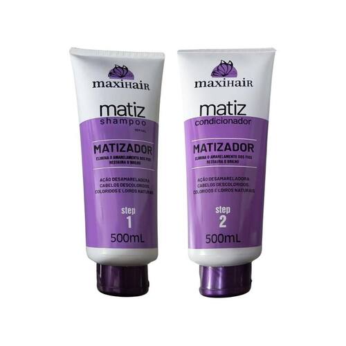 Esse kit contém: 1 Shampoo Maxihair 500ml Matizador e 1 Condicionador Maxihair 500ml Matizador.