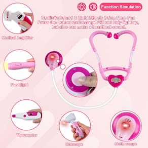 Kit médico para crianças -?Kit médico para crianças?Conjunto de jogos Kids Doctors Equipado com todas as ferramentas imagináveis de que você precisa para se tornar um futuro médico, dentista ou enfermeiro. Inclui um lindo brinquedo fofo para cachorros, casaco e chapéu médicos, bolsa médica, brinquedo estetoscópio, seringa, termômetro, pinça, bandeja, espelho dental, martelo médico, tesoura, óculos, otoscópio e muito mais. Este é um ótimo kit de cirurgião inicial para crianças que adoram fingir brincar e ajudar aqueles que sonham em se tornar médicos. -?Kit médico para crianças de 3 a 5?O kit médico infantil ensina as crianças a se familiarizarem com qualquer ferramenta médica e procedimento de consulta médica. Brinquedos educativos para crianças que melhoram a cognição e o desenvolvimento das crianças. Ótimo para fingir ser médico, enfermeiro ou paciente para aprender mais sobre saúde. Ajude seu filho a superar o medo de ir ao médico, aliviar a ansiedade e o desconforto durante as consultas e desenvolver compaixão e empatia. -?Seja um verdadeiro veterinário?Experimente o divertido e criativo jogo de vestir simulando ferramentas médicas e roupas realistas de enfermeira para se integrar melhor ao personagem. Quando você examina seu corpo com um estetoscópio iluminado, você pode ouvir seus batimentos cardíacos reais. Estimule a imaginação das crianças enquanto elas se vestem com lindos trajes médicos e chapéus e usam ferramentas médicas brilhantes nos filhotes. -?Sturdy Kids Doctors Play Set?Os brinquedos Doctor Kids são feitos de materiais amigáveis, bordas lisas e não afiadas e tamanho apropriado. O kit Kids Doctor Play é seguro e fácil de entender para as crianças. Os pais não precisam se preocupar com o fato de seus filhos serem arranhados enquanto interpretam. Todos os kits médicos podem ser armazenados na bolsa médica, mantendo o espaço arrumado e fácil de transportar e armazenar. As crianças podem aprender sobre o mundo real dos médicos de uma forma divertida. -?Presente iluminador divertido e ideal?Se você está procurando presentes de Natal, suprimentos surpresa para festas de Halloween, presentes especiais de aniversário ou presentes de cosplay. Nosso conjunto de brinquedos para médicos infantis é perfeito para crianças de 3 a 6 anos e oferece horas de valor educacional e de entretenimento. Ótimo para fingir, dramatizar, atividades educacionais, programações temáticas, ensino em sala de aula, festas de Halloween, Natal e surpresas de aniversário.