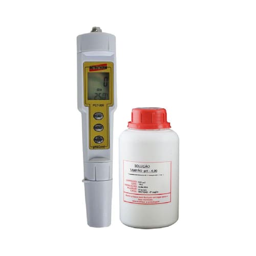 KIT MEDIDOR DE PH, CONDUTIVIDADE (EC) E TEMPERATURA DIGITAL TIPO CANETA MOD. PCT-200 + SOLUÇÃO TAMPÃO PH 4,00 MOD. ST-40 500ML DESCRIÇÃO: O medidor de pH, condutividade elétrica e temperatura tipo caneta a prova d´água modelo: PCT-200. Solução tampão ph 4,00 mod. st-40 500ml DESTAQUES: Leve e portátil, possuí três pontos de calibração, dísplay LCD retroiluminado, design a prova d’água IP65 e compensação automática de temperatura. APLICAÇÕES: Equipamento utilizado em controle e tratamento de água em criações peixes e camarões, sistemas de tratamento de água, estudo das condições de rios, utilizado em grandes aquários, entre outros 1) Mesmo que o medidor de pH não esteja em uso, é ideal realizar ajustes periódicos (ideal a cada 2 dias) com a solução tampão para garantir pleno funcionamento e vida longa ao instrumento. 2) As soluções são garantidas até sua abertura, portanto mesmo que armazenadas fechadas, após abertas, podem sofrer variações. ESPECIFICAÇÕES TÉCNICAS: MEDIDOR PH PCT-200: Display LCD de exibição dupla de 20mm x 27mm retroiluminado Função “HOLD” (Congela as leituras no display) Calibração em 3 pontos A prova d’água IP65 Compensação automática de temperatura Desligamento automático Eletrodo de medição destacável Medição de pH: Faixa de medição: 0,0 a 14,0pH Resolução: 0,1pH Precisão: ±0,1pH Pontos de calibração: pH4,00, pH7,00 e pH10,00 Medição de condutividade elétrica: Faixa de medição: 0 a 1999µS/cm Resolução: 1µS/cm Precisão: ±2% F.S Ponto de calibração: 1,413µS/cm Medição de temperatura: Faixa de medição: 0 a 50°C (32 a 122°F) Resolução: 0,1°C / 1°F Precisão: ±2°C / ±5°F Temperatura de Operação: 0 a 50°C (32 a 122°F) Umidade de Operação: <80% U.R Alimentação: 4 baterias LR44 de 1,5V Peso: 90g Dimensões: (C x L x A) 188 x 38 SOLUÇÃO TAMPÃO ST-40: Solução de calibração para medidores de ph Quantidade: 500ml Valor do ph: ph 04 (Ácido) ACESSÓRIOS FORNECIDOS: 1 - Solução em pó pH 10,01 1 - Solução em pó pH 4,01 1 - Solução em pó pH 7,00 1 - Solução tampão Ph ST-40 500ml 4 - Baterias LR44 de 1,5V Estojo para transporte Cartão para download do manual virtual
