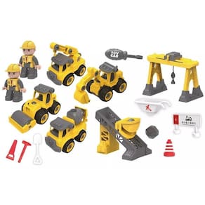 Contém: 25 peças 4 caminhões de construção, 2 bonecos e acessórios.