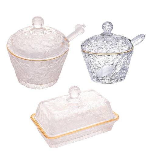 Kit com Meleira + Açucareiro E Manteigueira Cristal Martelado Cor: Cristal F7302 CONUNTO COM: Meleira De Cristal Martelado Com Colher E Tampa Com Borda Dourada Petra 10Cm - Lyor Açucareiro De Cristal Martelado Com Colher E Tampa Com Borda Dourada Petra 10Cm Manteigueira De Cristal Martelado com Tampa E Borda Dourada Petra 17Cm X 10,5Cm X 10Cm Nossas meleiras garantem um sabor a mais na hora de servir. Seu design elegante proporciona delicadeza à mesa. A LYOR proporciona qualidade e praticidade, sempredeixando sua casa mais completa. Matéria Prima: CRISTAL Forno: NÃO Fogão: NÃO Lava louça: NÃO Micro-ondas: NÃO Cuidados Limpeza e Manutenção: Lavar com detergente neutro, esponja macia e secar imediatamente. Não lavar em máquinas, não utilizar produtos químico.