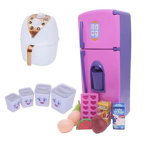o kit vem com geladeira com várias comidinhas, air fryer, potinho de mantimentos