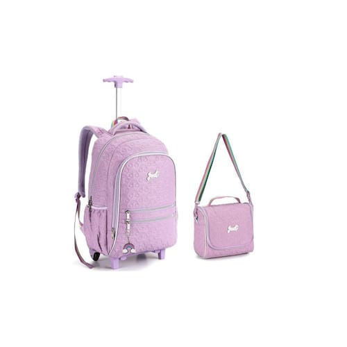 Kit Meninas Lilás Mochila de Rodas e Costas + Lancheira - Produzida em poliéster; - Possui alças para costas macias e confortáveis; - Possui 2 bolsos laterais, 2 frontais e 1 divisão grande; - Zíperes com puxadores reforçados; - Rodinhas produzidas em pvc gel de altíssima resistência; - Puxador do carrinho produzida em alumínio e pvc; - Estampa estilizada; - Alça para mão; - Dimensões da mala: 42 x 32 x 21 cm alt x larg x prof ; Lancheira Out 52060; - Produzida em poliéster; - Possui 1 bolso lateral 1 frontal e 1 divisão grande; - Forro interno em pvc; - Estampa estilizada; - Zíperes com puxadores reforçados; - Alça transversal removível; - Alça para mão; - Dimensões: 23 x 24 x 15 cm alt x larg x prof ; - Não Acompanha garrafinha e porta lanche ;