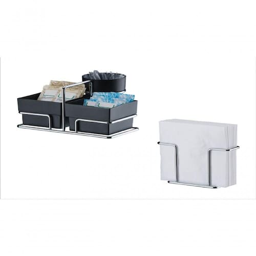 1 und Organizador para Sachês de Açúcar/Adoçante e Mexedor: Profundidade: 14cm / Largura: 15cm / Altura: 7,5cm / Peso: 0,176 kg. Com alça para facilitar o transporte ao servir seus convidados. O conjunto para chá e café é prático e funcional, ideal para levar à mesa ou deixar na bancada do café. Os recipientes plásticos são ideais para armazenar saquinhos de chá, sachês de açúcar e adoçante e os mexedores. Além do tradicional tratamento superficial da Future - onde são aplicadas até 4 camadas de metal - os produtos são revestidos com uma camada extra do protetivo especial Rust Free, garantindo cores vivas e brilhantes, além de maior resistência contra ferrugem. MODELO 1156PT