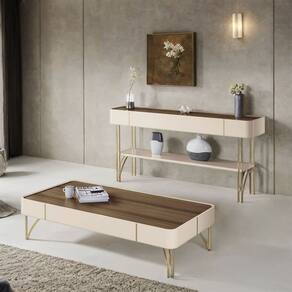 A mesa de centro apresenta cantos arredondados e pés de aço maciço dourado, combinando perfeitamente com o aparador, que possui prateleira inferior robusta e detalhes refinados. Produzidos em MDF de alta qualidade e acabamento premium em Impressão UV Texturizada, ambos garantem durabilidade e requinte para sua decoração.