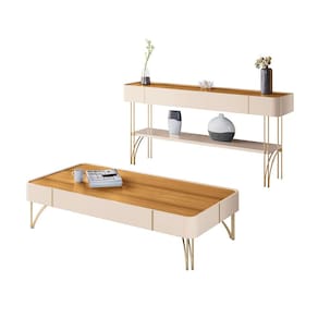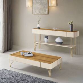 A mesa de centro apresenta cantos arredondados e pés de aço maciço dourado, combinando perfeitamente com o aparador, que possui prateleira inferior robusta e detalhes refinados. Produzidos em MDF de alta qualidade e acabamento premium em Impressão UV Texturizada, ambos garantem durabilidade e requinte para sua decoração.