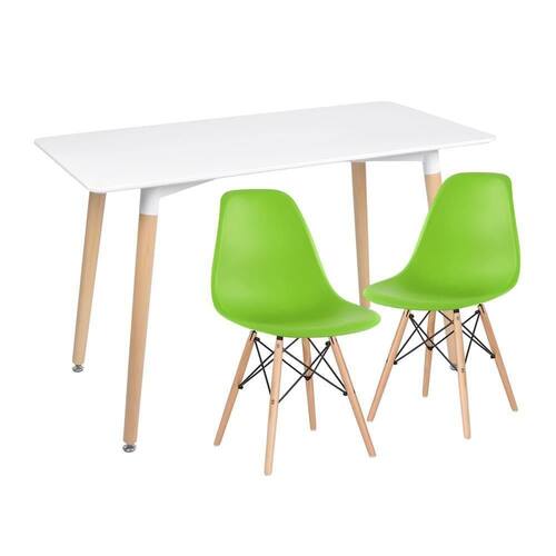 Cadeira modelo Eames DSW: Material do assento: Polipropileno - Material da base: Madeira e aço - Altura do encosto: 81 cm - Altura do assento: 43 cm - Largura do assento: 46 cm - Profundidade do assento: 40 cm - Distância entre os pés: 40 cm - Peso suportado: 130 kg. Mesa de jantar retangular: Material do tampo: MDF laqueado (Laca fosca) - Material dos pés: Madeira natural - Altura: 75 cm - Largura do tampo: 120 cm - Comprimento do tampo: 60 cm - Garantia: 3 meses.
