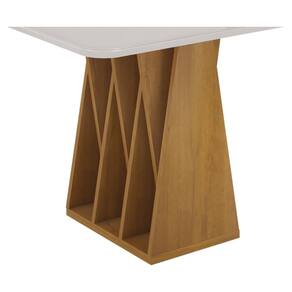 O tampo em MDF com vidro traz elegância e fácil limpeza, enquanto a base moderna valoriza o ambiente.
