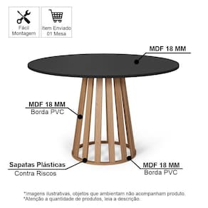 O conjunto é composto por uma mesa de jantar e 4 cadeiras, sendo que a mesa de jantar possui seu tampo e base fabricados em MDF 18 MM de altíssima qualidade em formato redondo com tamanho 120,00 CM.