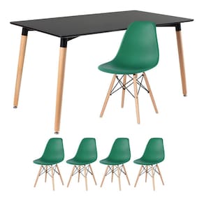 Cadeira modelo Eames DSW: Material do assento: Polipropileno - Material da base: Madeira e aço - Altura do encosto: 81 cm - Altura do assento: 43 cm - Largura do assento: 46 cm - Profundidade do assento: 40 cm - Distância entre os pés: 40 cm - Peso suportado: 130 kg. Mesa de jantar retangular: Material do tampo: MDF laqueado (Laca fosca) - Material dos pés: Madeira natural - Altura: 75 cm - Largura do tampo: 140 cm - Comprimento do tampo: 80 cm - Garantia: 3 meses.